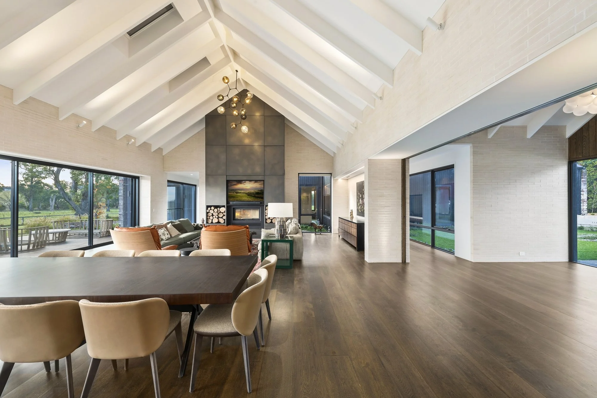 Positioned on 100 acres of rolling farmland, this New Zealand-inspired pavilion home by Tziallas Architects is designed for connection to nature. A central atrium garden anchors the living space, with expansive views over the tiled in-ground pool and countryside beyond. Crafted with charred spotted gum cladding, standing seam roofing, European Oak floors and doors, terrazzo tiles, and a micro-cement kitchen splashback, the home features luxurious hydronic heating and refined natural textures throughout.