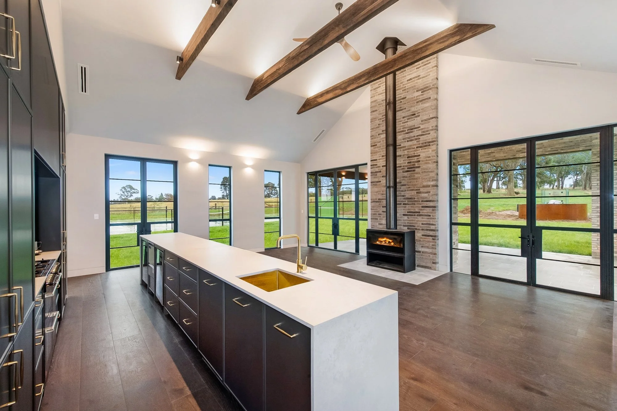 The main residence includes four master bedrooms with ensuites, open plan living, a media room, butler’s pantry, and standout kitchen by FAF Woodwork featuring an AGA stove, built-in bar with ice trough, and wine fridges. Reclaimed hardwood, solid steel brackets, corten fireplace, and dry-pressed clay bricks blend rustic character with modern functionality. Micro-cement bathrooms, limestone floors, hydronic heating, and ducted air con complete the home.